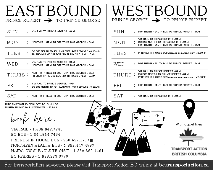 Kathleen, a Transport Action BC member from Prince Rupert, is a regular user of intercity public transportation services in the Prince Rupert to Prince George corridor (Highway 16, also called the Highway of Tears). One of her concerns was the lack of a simple source of schedule information showing which train or bus service was available on which days. The information can be searched on the web, but this is frequently not an option in remote parts of the province. The demise of Greyhound and its skeletal replacement, BC Bus North, further highlighted the need for easy to access schedule information. Northern Health Connections, Friendship House, and Haida Gwaii Eagle Transit all operate services in the region, with various schedules and availability rules.