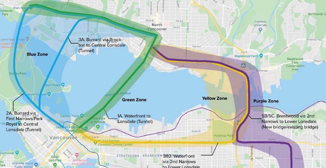 The study proposes three colour “options”; a Blue Zone running from Burrard Station on Vancouver’s downtown waterfront through either Stanley Park or Brockton Point and tunnelling over to either West Vancouver “Option 2A Eastern, Mid, Western” or to North Vancouver “Option 3”. All four proposed Blue Zone routes continue on to central Lonsdale in North Vancouver.